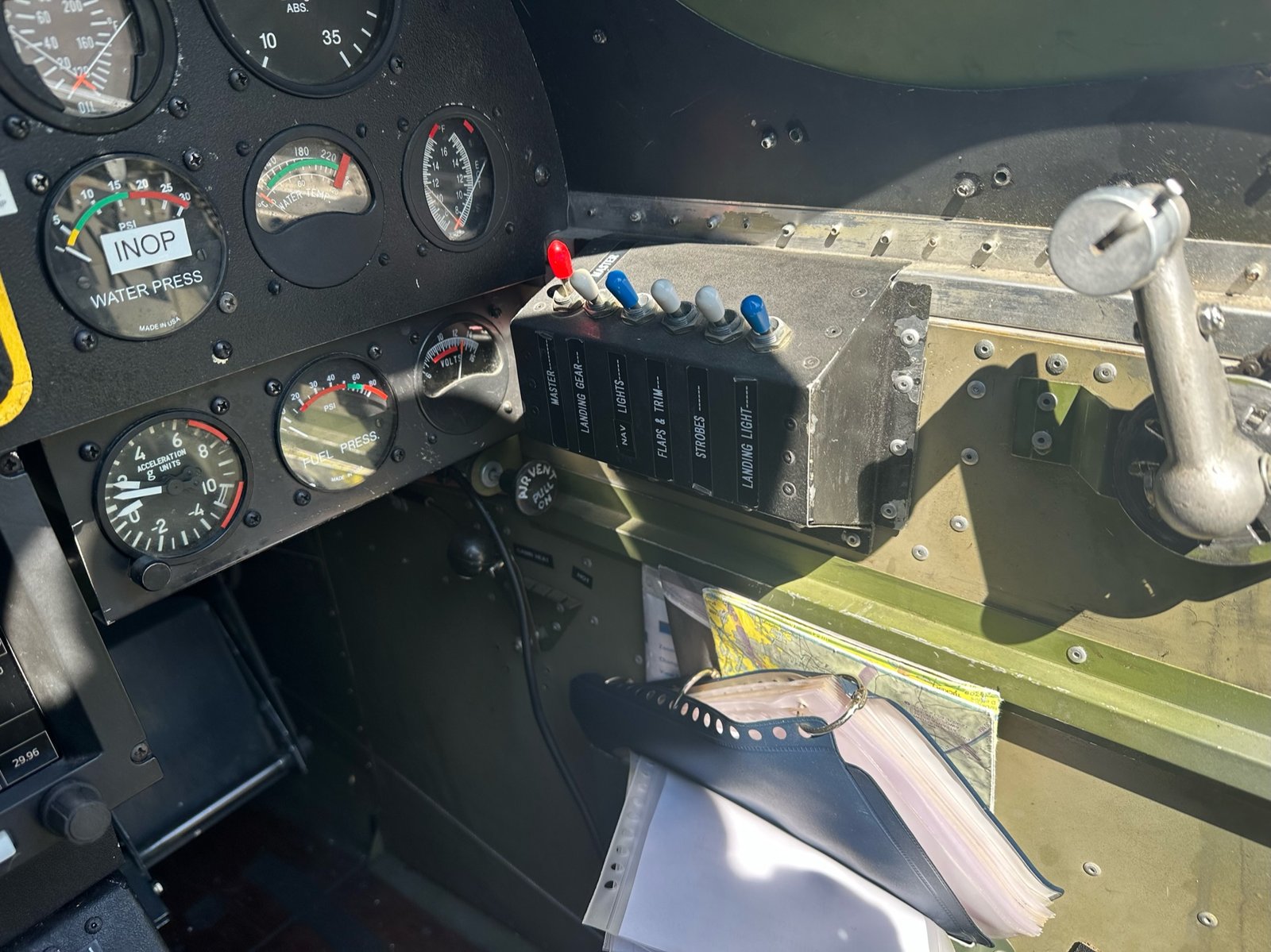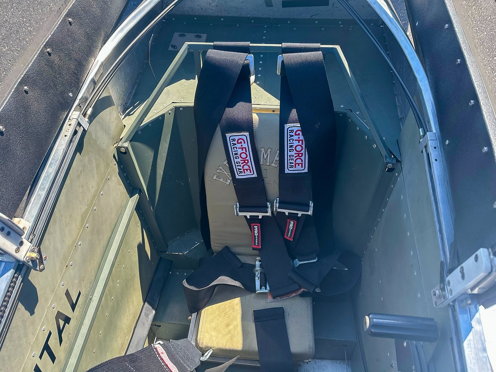 The interior of the aircraft offers tandem seating and dual controls with the look of a real P51D. The inside is green with tan seats, and a black panel.