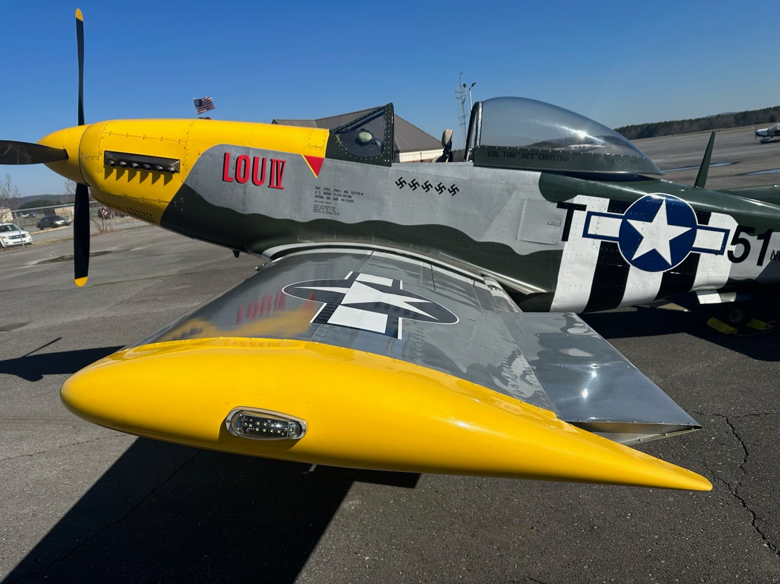 The exterior of this aircraft is painted as “Lou IV”, the most photographed P51 of WWII flown by fighter ace Col. Thomas J.J. Christian of the 375th F.S.